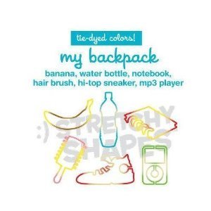 Tie-Died Waves of Backpack Contents! Quantity: one pack of 24 MY BACKPACK shapes. Includes 4 each of 6 shapes: Banana, Water Bottle, Notebook, Hair Brush, Hi-top Sneaker, MP3 Player. The gotta-have nation-wide craze, these silicone rubber bands are definitely a cut above. Beautiful brilliant colors, well packaged, nicely molded and sized to not be too tight on your wrist. These colorful Tie Dyed Bands will help you hold things together. Once your task is finished...They will return to their original MY BACKPACK shape... What Fun! Bring the fun back into your home or office with these clever Tie-Dye Colored Shaped Rubber Bands! Packed in a durable clear zipper bag with a chain to attach to your keyring or backpack! They look and behave like normal (albeit colorful) rubber bands when stretched. But when removed from whatever they are holding, they instantly spring back into their original MY BACKPACK shapes! For ages 5 years and up.